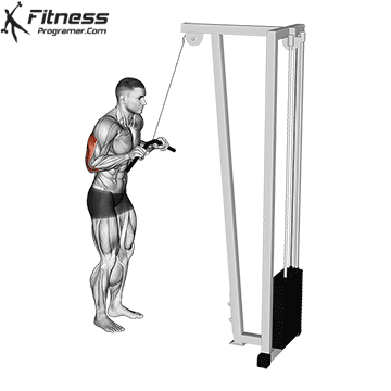 - 케이블 푸쉬다운: 바를 잡고 팔꿈치를 몸통에 고정한 채, 아래로 밀어내는 동작입니다. 손목이 꺾이지 않도록 주의하고, 팔꿈치가 움직이지 않게 해야 삼두근에 제대로 자극이 갑니다.